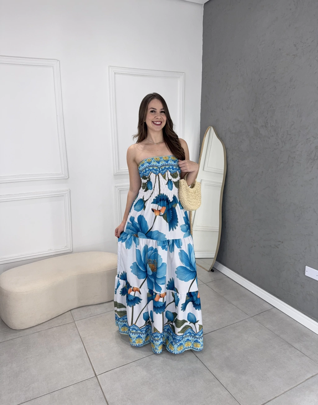 Descubra o Vestido Longo Fenda Tropical Jardim Rosa, confeccionado em tecido sedinha suave e elegante.